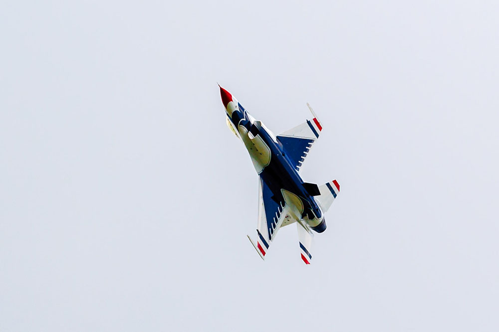 Photo by Rick Pepper – 2015 Mankato Air Show – Thunderbird aircraft 1-4 clearing the tree tops as they perform the diamond with the lead aircraft invertedPhoto by Rick Pepper – 2015 Mankato Air Show – Thunderbird aircraft 1-4 fly in the Arrowhead formationPhoto by Rick Pepper – 2015 Mankato Air Show – One of the solo Thunderbird aircraft turns to re-position for the next maneuver