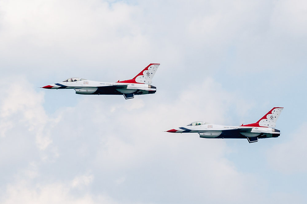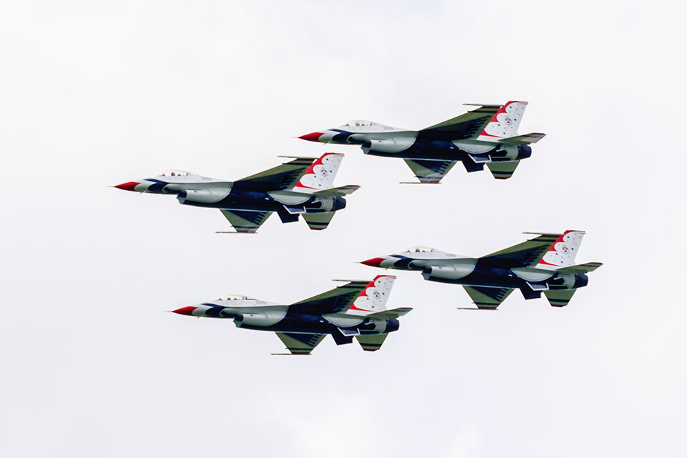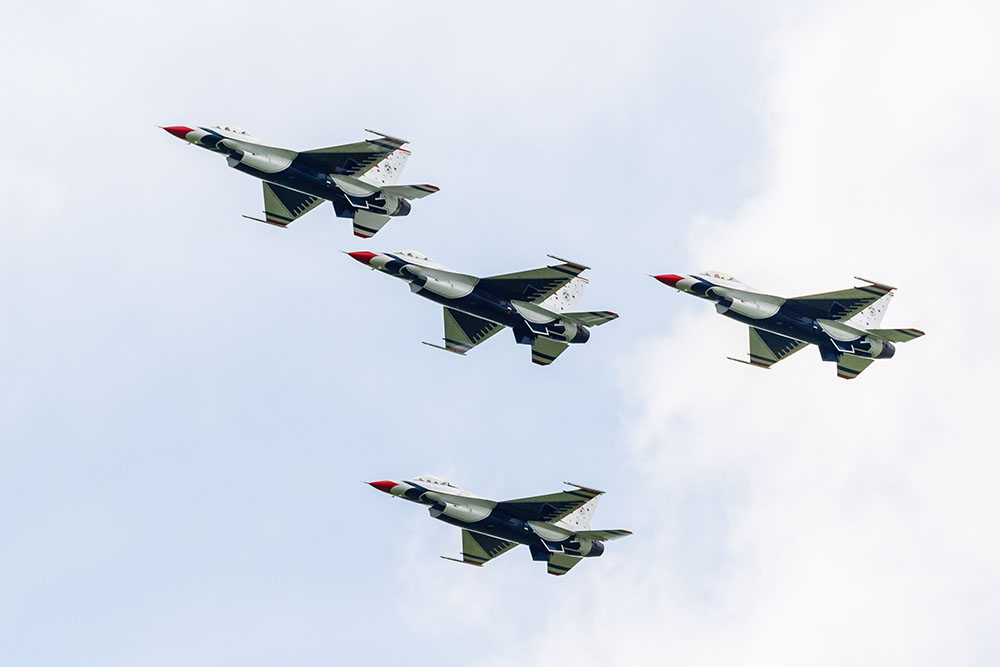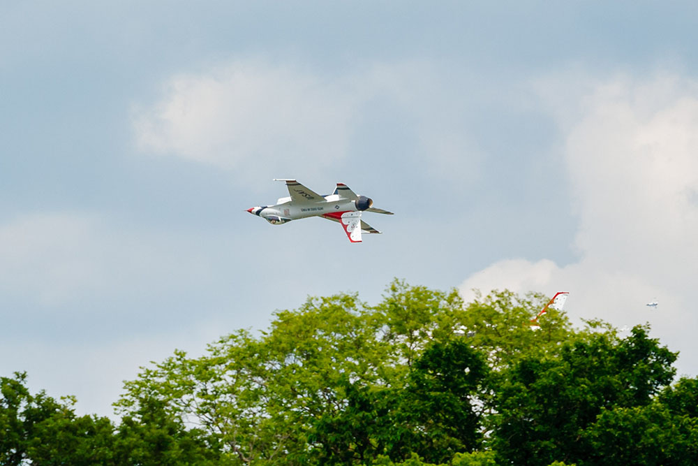 Photo by Rick Pepper – 2015 Mankato Air Show – USAF Thunderbirds flying the diamond formation as they approach the airportPhoto by Rick Pepper – 2015 Mankato Air Show – Both Thunderbirds solo aircraft approach the airport