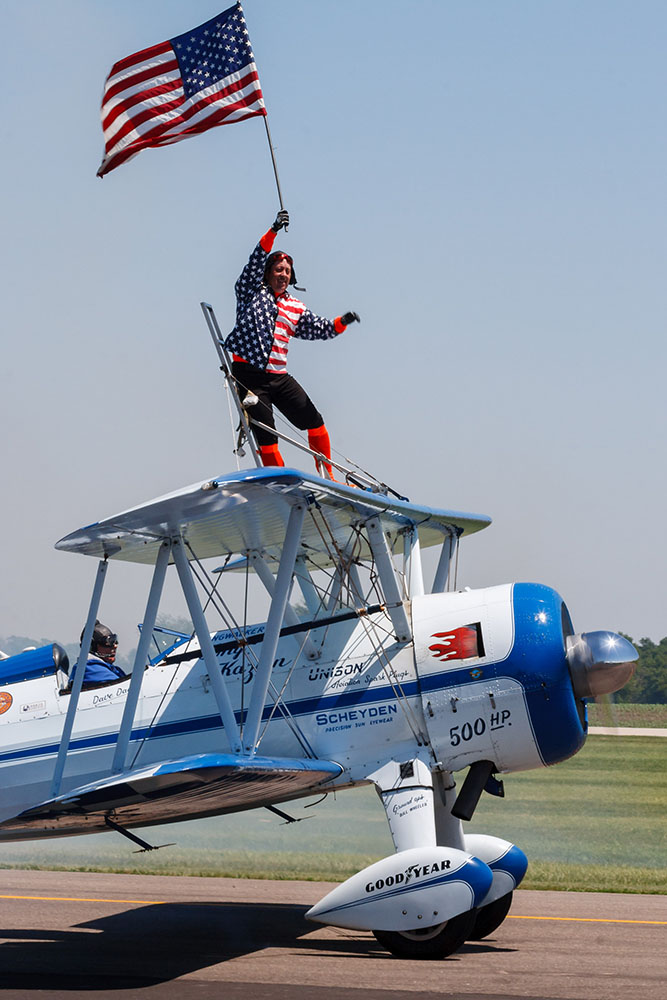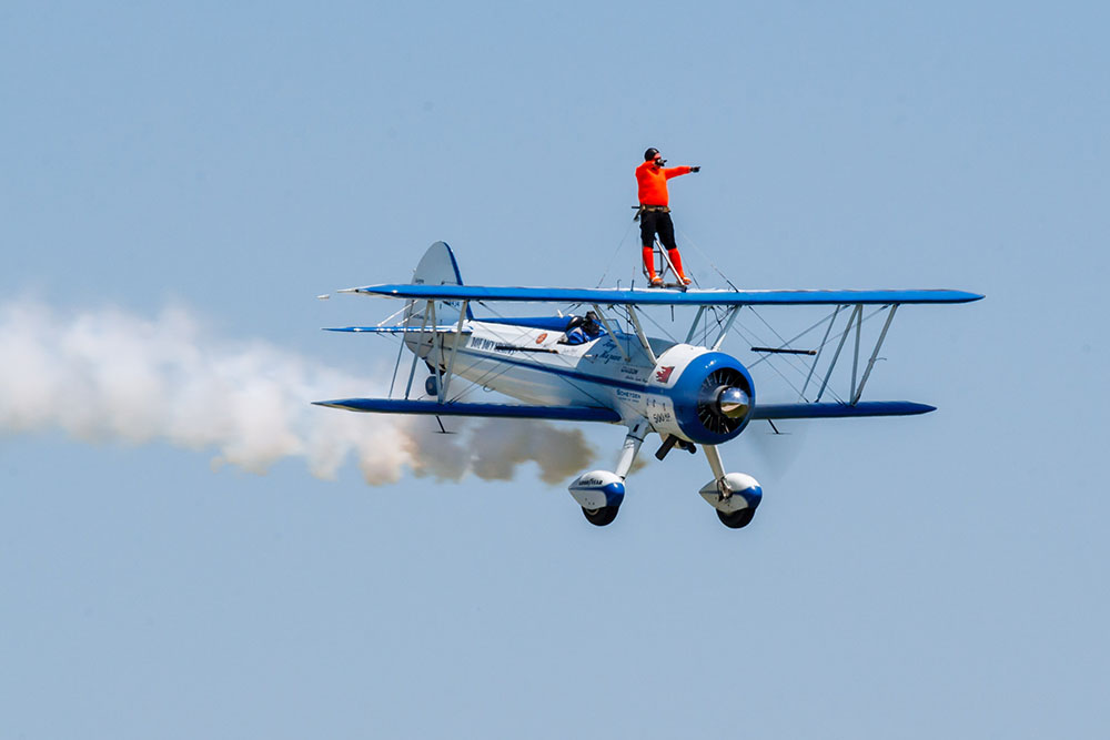 Photo by Rick Pepper – 2012 Mankato Air Show – Wing-walker Dave Kazian & stunt pilot Dave Dacy do a barrel roll in their Super StearmanPhoto by Rick Pepper – 2012 Mankato Air Show – Wing-walker Dave Kazian & stunt pilot Dave Dacy make a level pass