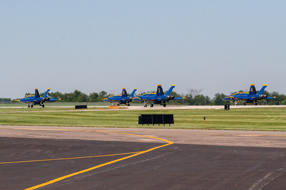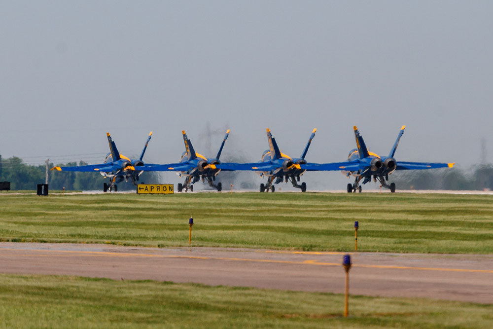 Photo by Rick Pepper – 2012 Mankato Air Show – Blue Angel aircraft #1-4 taxi to the end of the runway before taking offPhoto by Rick Pepper – 2012 Mankato Air Show – Blue Angel aircraft #1-4 taxi to the end of the runway. Note the distortions from their super-heated jet turbine exhaust